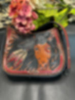 12x9x4. Hand carved and painted. One of a kind design. Fully carved front with pocket on outer back. One inner pocket. Fully lined. Adjustable removable strap. Genuine Swarovski crystals in bronze.