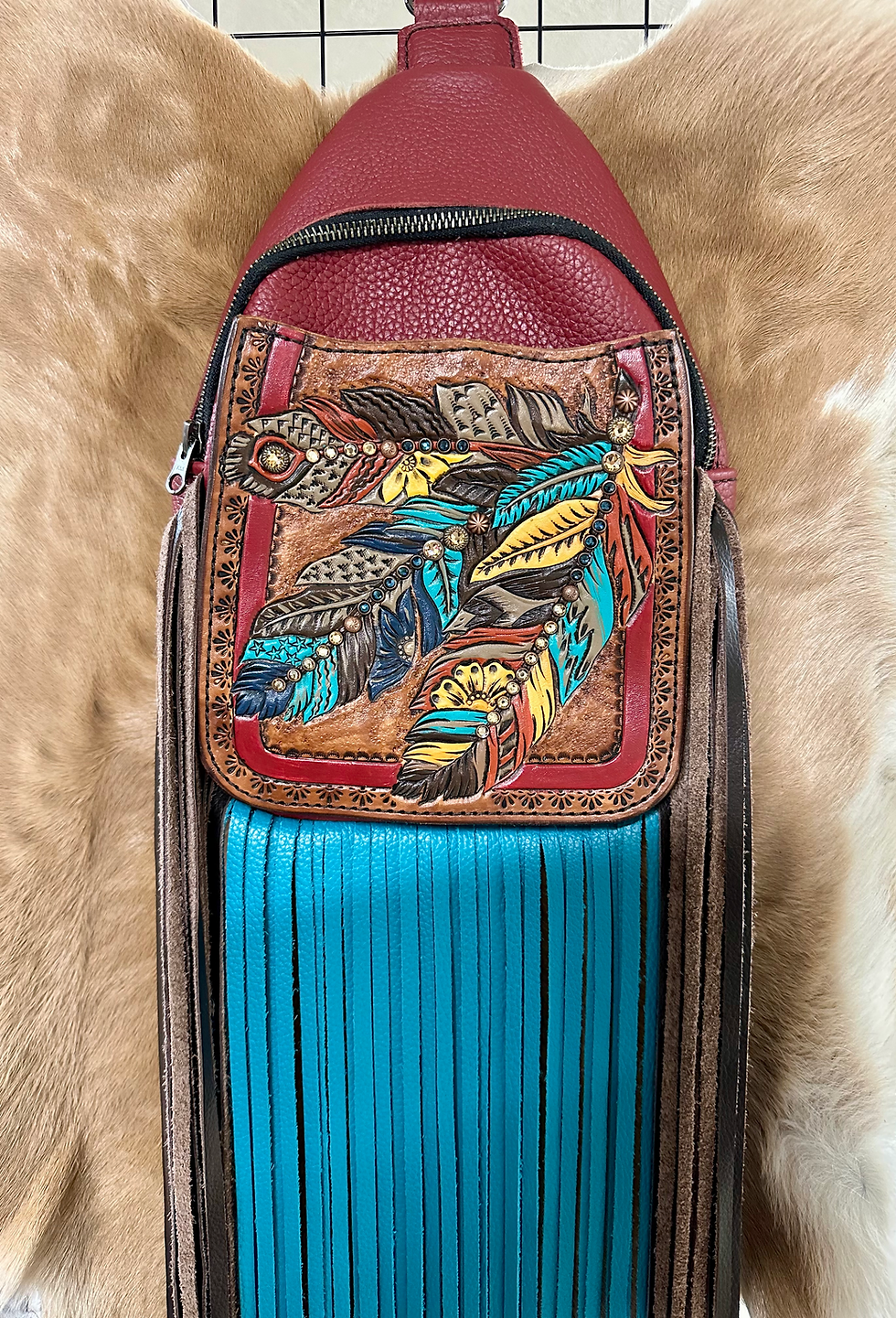 High grade leather in dark chocolate. Hand carved and painted. Swarovski crystals in light smoke and gold . Steel studs. Adjustable removable strap that is carved and painted to match. 10x5